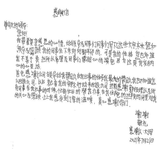 经过半个月治疗休养,刘军手部已无大碍。出院后的他写了一封感谢信并为公司送了一面锦旗,他说道,是哈尔滨邵鸣绿色住宅建设有限公司这个大家庭让他感受到了关怀和温暖,他表示要把这种关怀变成工作上的动力,争取早日返回工作岗位,努力工作,回报大家的关心和关爱。